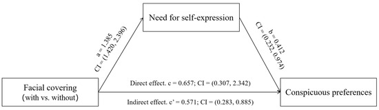 The results revealed a significant mediation effect of face mask-wearing (with vs. without) on conspicuous preferences (indirect effect (a × b) = 0.571, 95% CI = [0.283, 0.885]) and a significant direct effect (direct effect [c] = 0.657, 95% CI = [0.307, 2.342]), indicating partial mediation by the need for self-expression. Moreover, the proportion of total effect mediated was 46.5%, demonstrating that nearly half of the relationship between facial covering and consumption preferences operates through this psychological mechanism. These metrics underscore the significance of the mediating role played by self-expression needs.