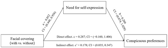 The mediating role of the need for self-expression was identified. Firstly, participants in the experimental group reported higher levels of need for self-expression (Mwith-mask-wearing = 5.72, SD = 0.56, Mwithout-mask-wearing = 5.01, SD = 0.89; F(1,134) = 29.984, p < 0.001). Then, mediation analysis was conducted using conspicuous preferences as the dependent variable and wearing face masks (0 = without, 1 = with) as the independent variable. The need for self-expression was designated as the mediator, with gender, age, and education level included as control variables. The variables were entered into Model 4 of the PROCESS procedure (Hayes, 2017; see Figure 4; coefficients have been standardized). The difference in the need for self-expression between the with-mask-wearing and without-mask-wearing conditions (β = 0.852, p < 0.001, 95% CI = [0.448, 0.956]) and the difference in conspicuous preferences attributable to the difference in the need for self-expression (β = 0.209, p < 0.05, 95% CI = [0.074, 1.028]) were significant and positive. The results revealed a significant mediation effect of face mask-wearing (with vs. without) on conspicuous preferences (indirect effect (a × b) = 0.178, 95% CI = [0.035, 0.347]) and a significant direct effect (direct effect [c] = 0.287, 95% CI = [−0.160, 1.406]), indicating full mediation by the need for self-expression in this experimental scenario.