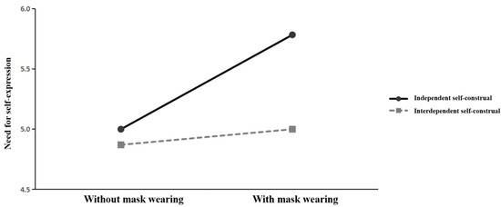 Using Model 7 in PROCESS (Hayes, 2017; assuming that the first half of the mediation model is moderated), the study verified the moderating role of self-construal. Face mask-wearing (without = 0, with = 1) and need for self-expression were set as the independent and mediator variables, respectively. The type of self-construal (0 = interdependent, 1 = independent) was used as the moderator, and gender, age, and education level were considered as control variables. Lastly, the conspicuous preference was entered as the dependent variable. The results (Figure 5) indicate a significant interaction between wearing face masks and self-construal (β = 0.654, t = 1.778, p = 0.078). Specifically, wearing face masks exerted a significant positive effect on the need for self-expression among individuals with an independent self-construal (95% CI: LLCT = 0.272, ULCI = 1.294), with an effect size of 0.783. In contrast, this effect was non-significant among individuals with an interdependent self-construal (95% CI: LLCT = −0.390, ULCI = 0.649). Furthermore, the need for self-expression (mediator) positively impacted conspicuous preferences (β = 0.623, t = 6.101, p < 0.001). These findings provide support to H3, demonstrating that compared with individuals with an interdependent self-construal, those with an independent self-construal exhibit higher levels of need for self-expression when using a facial covering, which subsequently positively impacted their conspicuous preferences.