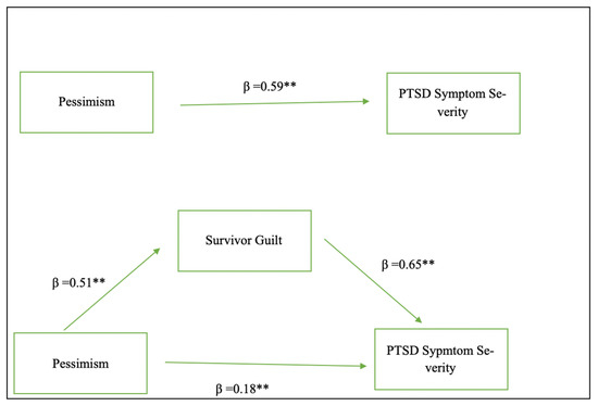 Mediation model of the relationship between pessimism, survivor guilt, and PTSD symptom severity. ** p = 0.00.
