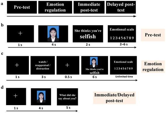 Experimental procedure. (a) Experimental phase and task, (b) flow chart of a single trial in the pre-test phase, (c) flow chart of a single trial for emotion regulation tasks, and (d) flow chart of a single trial in immediate/delayed post-test.