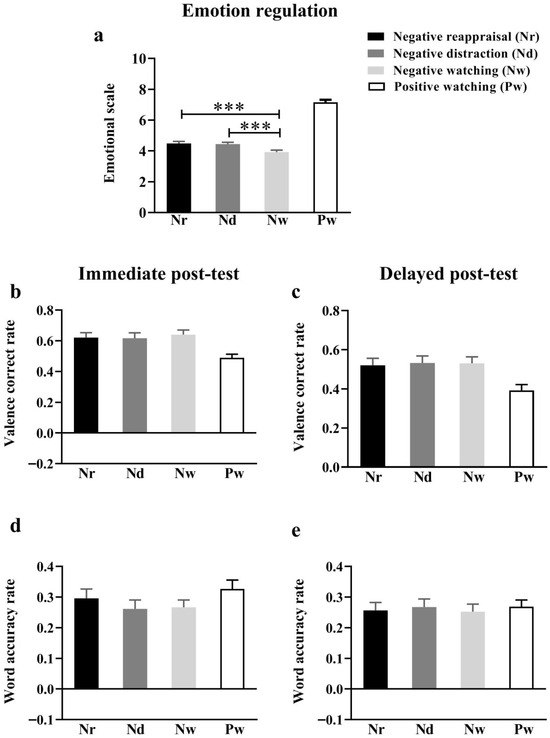 Self-reported emotional scores and recall accuracy of participants in the emotion regulation/immediate/delayed post-test. (a) Self-reported emotional scores in the emotion regulation, (b) valence correct rate in immediate post-test, (c) valence correct rate in delayed post-test, (d) word accuracy rate in immediate post-test, (e) W=word accuracy rate in delayed post-test. *** p < 0.001.