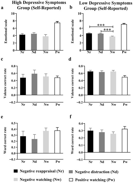 For the self-reported low-depressive symptom group, emotion regulation had no significant effect on either the valence correct nor the word accuracy rates for negative social feedback-related memories (valence correct rate: F(2, 104) = 0.19, p = 0.83, = 0.004; word accuracy rate: F(2, 104) = 0.72, p = 0.49, = 0.02) (Figure 4d,f). Nor was the main effect of emotion regulation significant in the self-reported high-depressive symptom group (valence correct rate: F(2, 18) = 1.23, p = 0.32, = 0.13; word accuracy rate: F(2, 18) = 3.40, p = 0.08, = 0.41) (Figure 4c,e).