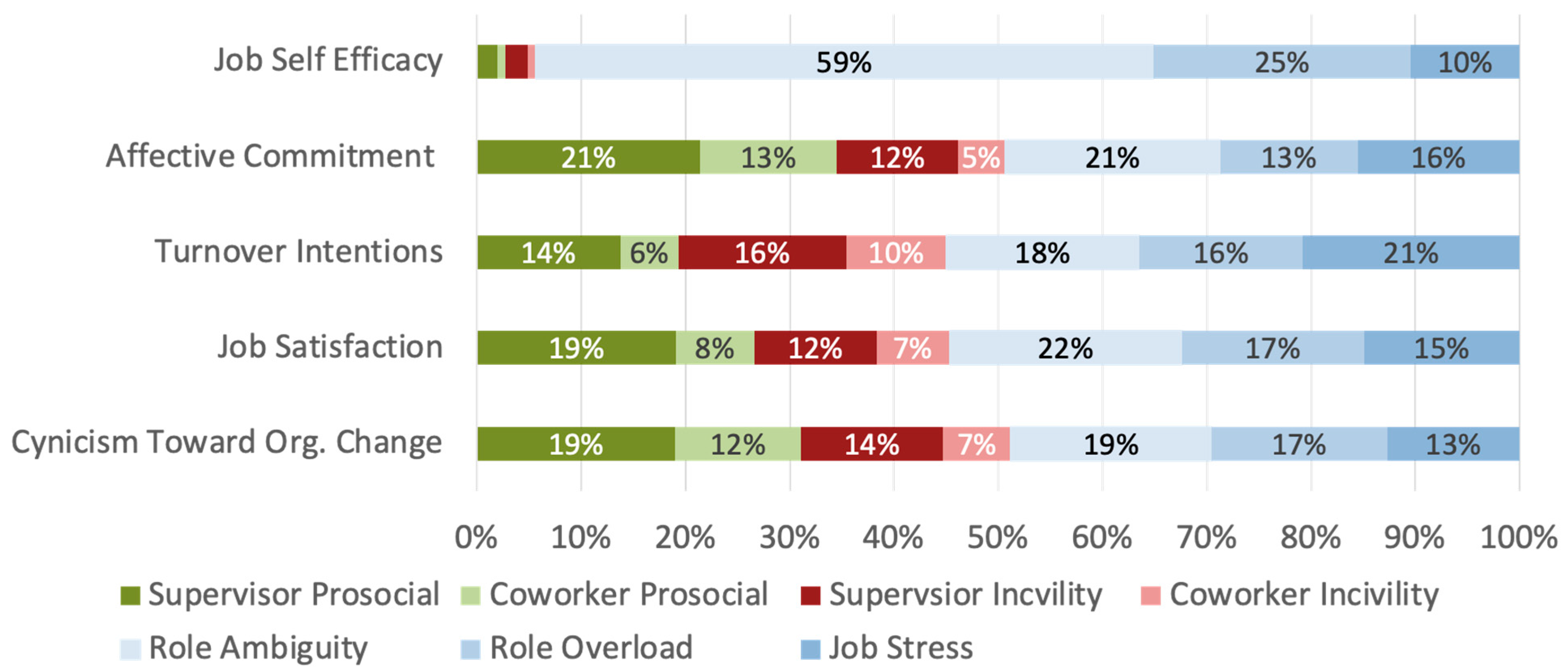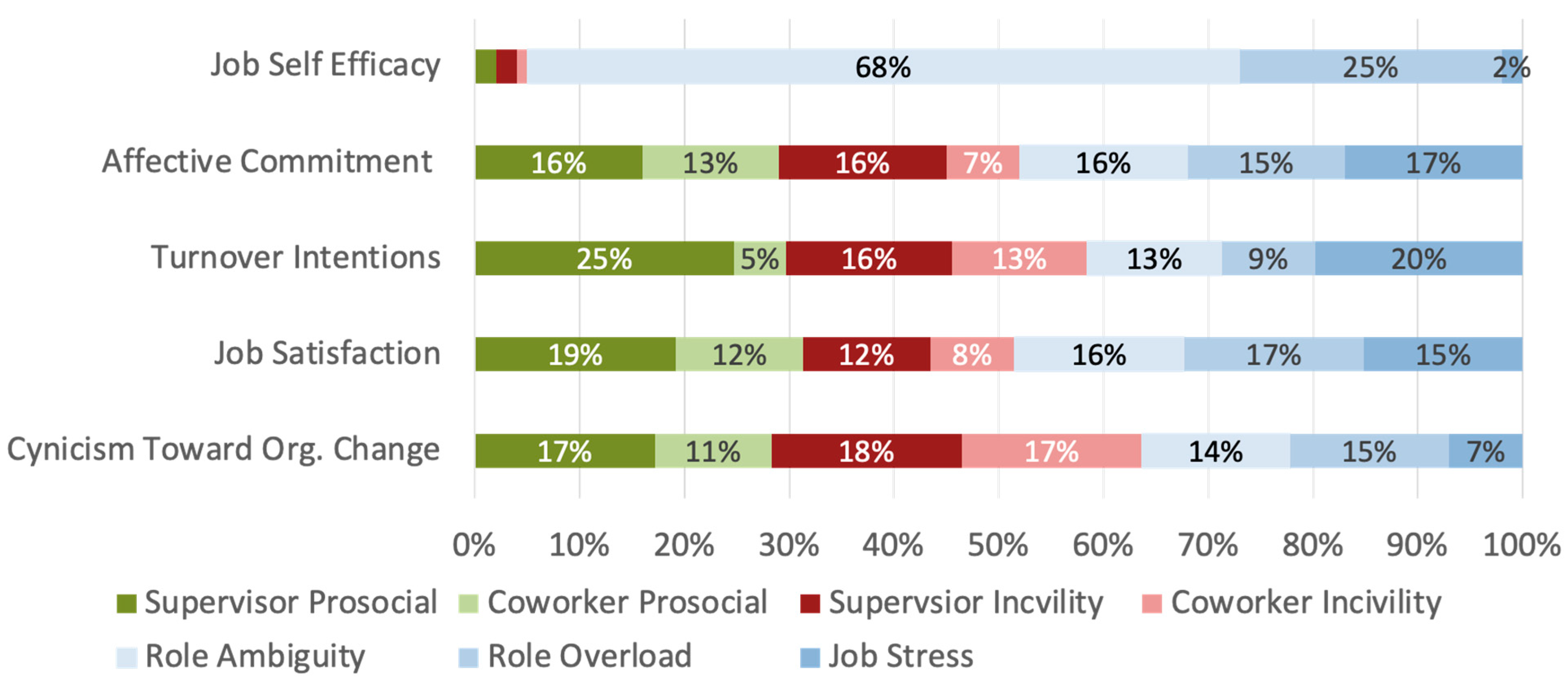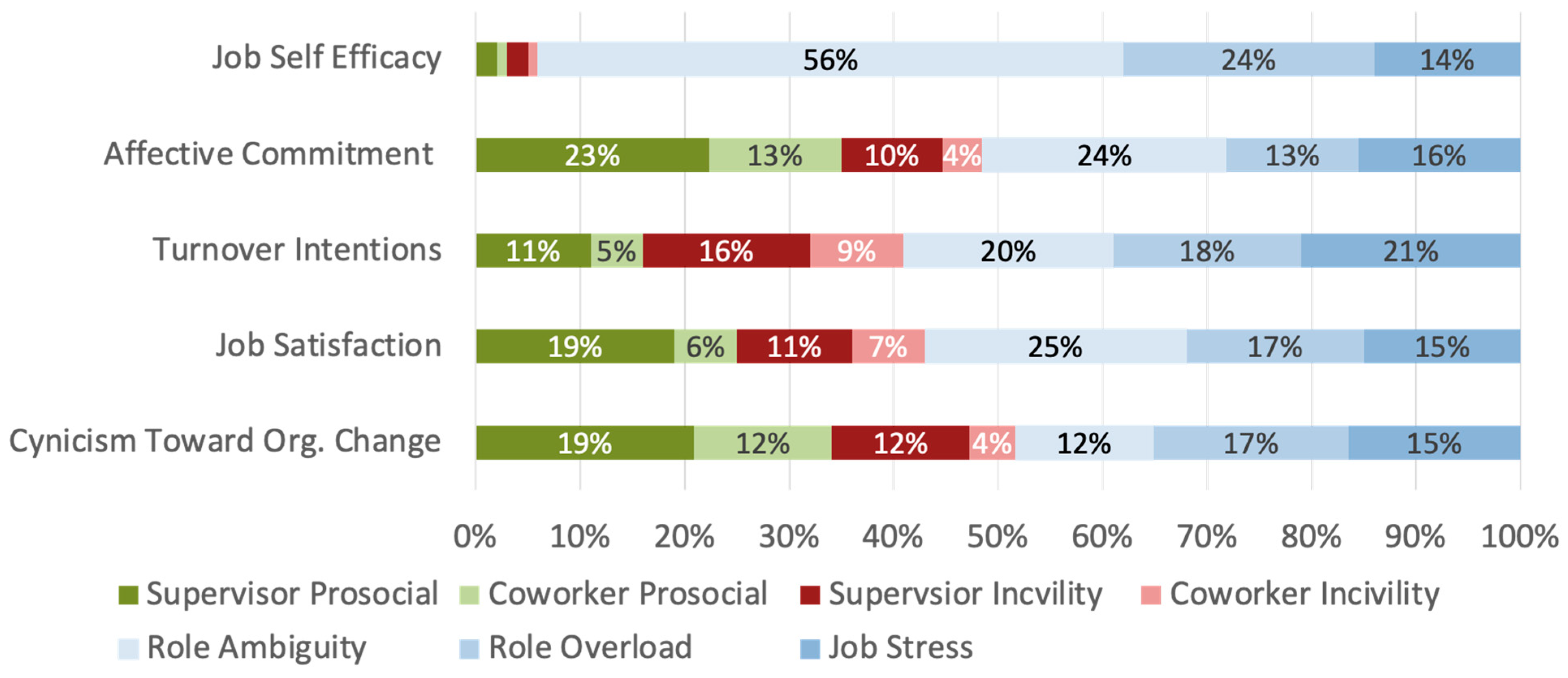 Focusing on the unique contributions of interpersonal experiences, supervisor experiences, both prosocial and uncivil, were established as particularly important for shaping job attitudes. When cynicism toward organizational change was the outcome, the full model accounted for 29% of variance. Of that 29%, supervisor prosocial experiences accounted for 19% of variance, and supervisor incivility accounted for 14% of variance. Coworker prosocial and incivility experiences accounted for 13% and 7% of variance, respectively. For job satisfaction, supervisor prosocial experiences once again emerged as the strongest explanatory factor (19%), followed by supervisor incivility (12%), coworker prosocial experiences (8%), and coworker incivility (7%). Thirty percent of the variance in turnover intentions was accounted for by this model. Supervisor incivility explained the most variance in this model (16%), followed by supervisor prosocial experiences (14%), then coworker incivility (10%), and finally coworker prosocial experiences (6%). Finally, when affective commitment was the outcome of interest, 32% of variance was accounted for. Supervisor prosocial experiences accounted for over one-fifth of the variance (21%). Coworker prosocial experiences were the next strongest contributing factor at 12%. Supervisor (12%) and coworker (5%) incivility accounted for the remaining variance. Visualization of this breakdown can be found in