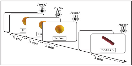Illustration of a trial during the learning phase, involving the presentation of the orthographic form of a non-word (e.g., “lufen”) alongside its corresponding image (apricot), and the audio pronunciation of the non-word (/lyfã/).
