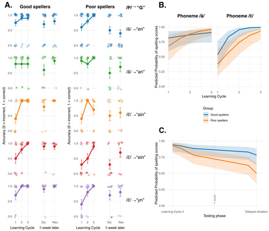 A second GLMM included data from learning phase 3 and the delayed dictation, corresponding to the fourth testing phase, to analyze consolidation and retention. Because the model failed to converge with the same structure as Equation (1), we simplified the model and removed the phoneme factor. Akaike’s Information Criterion (AIC) indicated that this structure was the best-fitting model. Fixed effects of this model included group (two levels: good vs. poor spellers; good spellers as the reference level), testing phases (two levels: dictation after learning phase 3 and delayed dictation; third learning phase as the reference level), and their interaction. Random intercepts were included for participants and items. Again, simple slope analyses were conducted using the emtrends function from the emmeans package.