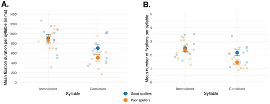 - During the visual exploration of non-words, both groups were predicted to fixate more often and for longer durations on the inconsistency in order to learn the spelling (Ginestet et al., 2022). Since inconsistencies represent a challenge in spelling, they might require multiple fixations before orthographic representations become well-specified.