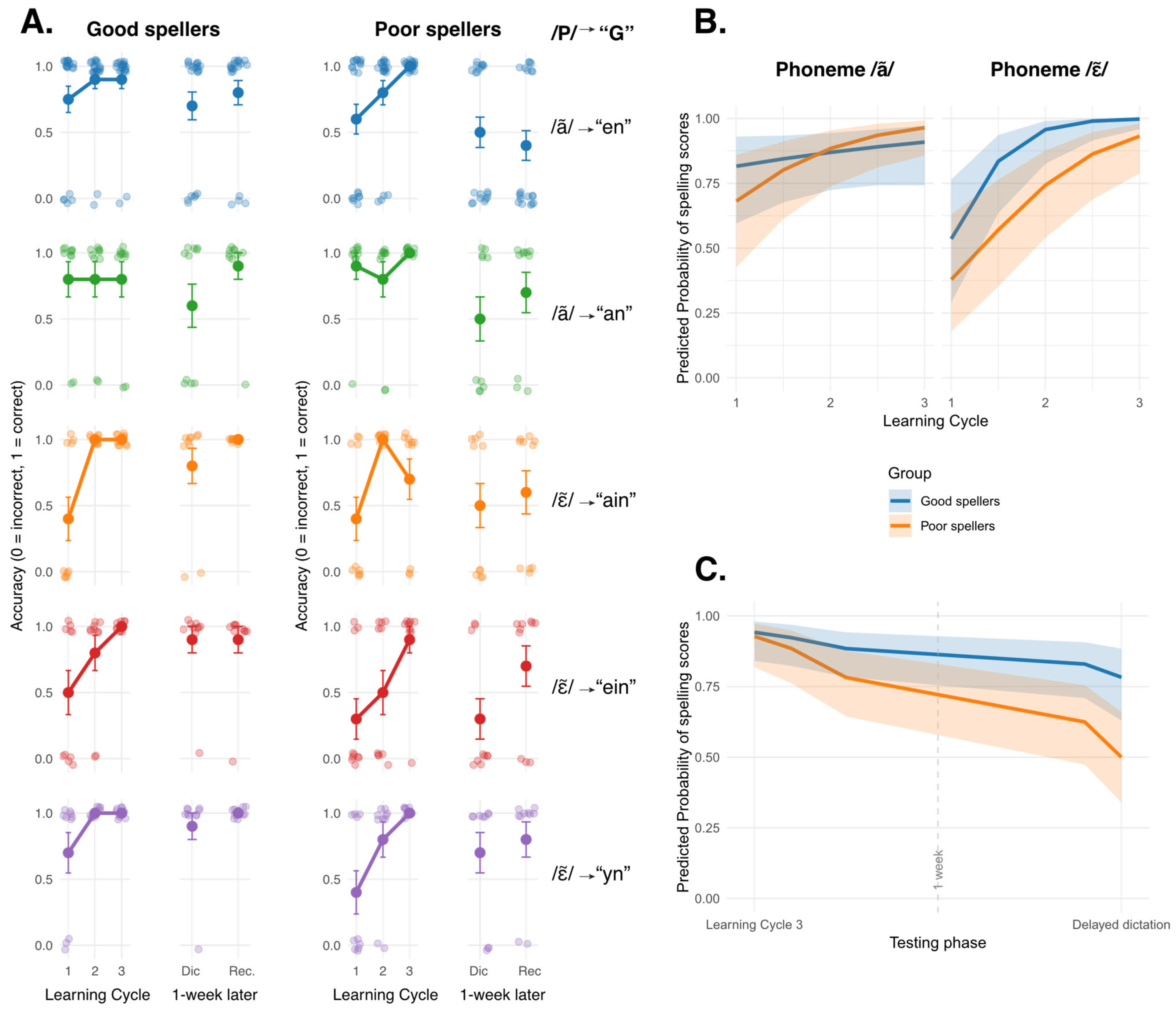 - Across learning cycles, both groups were expected to learn the spelling of non-words. However, poor spellers were predicted to obtain lower dictation scores in the first learning cycle and to reach the performance of their peers by the final exposure (Binamé et al., 2015; Mehlhase et al., 2019). Both groups were also expected to show a decrease in fixation durations and number of fixations across exposures, reflecting progressive orthographic learning (Joseph & Nation, 2018; van Viersen et al., 2022). For long-term retrieval, good spellers were anticipated to show a slight decrease in their performance after a one-week delay, as typically observed, whereas poor spellers were expected to exhibit a larger decline (Binamé et al., 2015; Mehlhase et al., 2019).