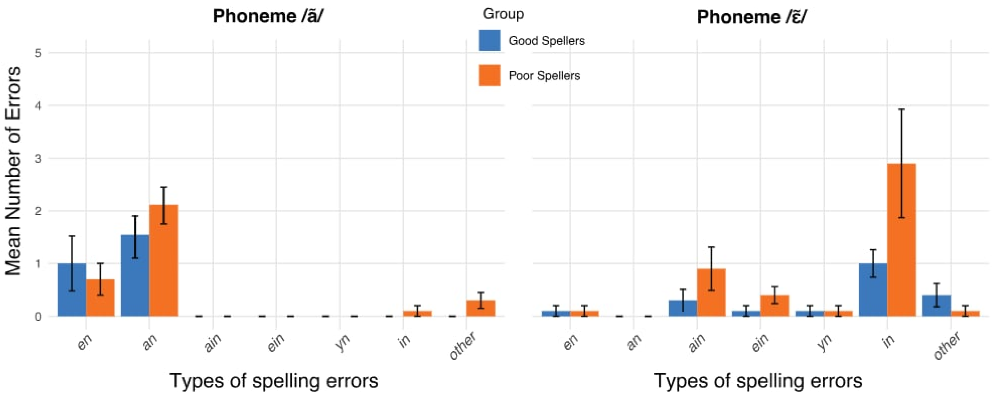 In addition, we documented the specific spellings produced when errors occurred. These analyses were based solely on data from the dictation task, which allowed us to quantify the frequency of each spelling error type separately for non-words containing the phonemes /ã/ and //.