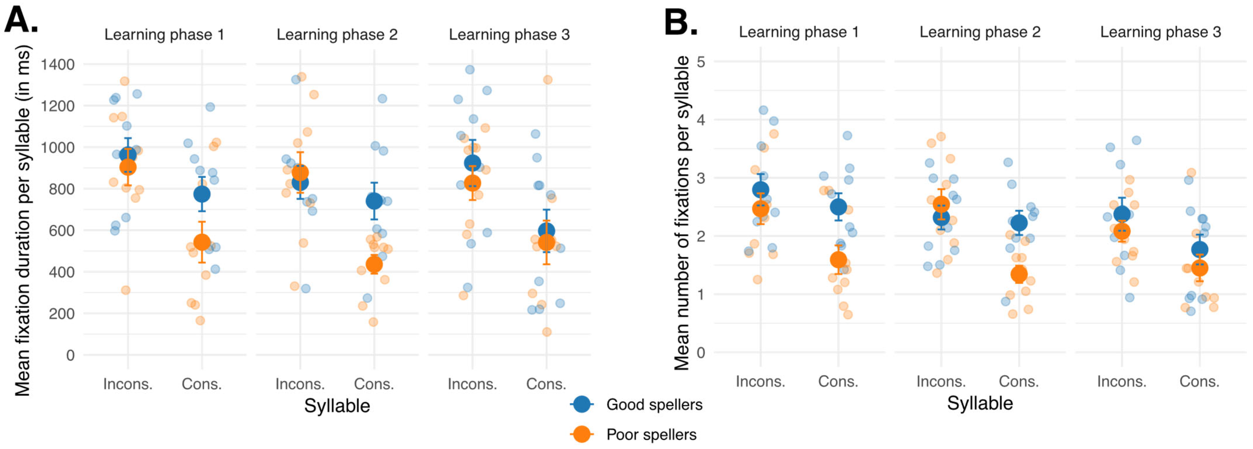 Cleaned fixation data were then reorganized by syllable to examine the effects of group, syllable, and learning phase on fixation duration and number of fixations. For each non-word, the total fixation duration and number of fixations per syllable were the dependent variables. Because syllable length varied (two to four letters), both fixation durations and number of fixations were weighted by letter, for each syllable individually, to avoid a length effect. To do so, eye-movement measures were divided by the number of letters per syllable. For instance, in the non-word “lufen”, fixation measures were divided by 2 for the first syllable (“lu”) and by 3 for the second syllable (“fen”). In the non-word “notain”, they were divided by 2 for “no” and by 4 for “tain”. These normalized measures represented, in the following analyses, the mean fixation duration and the mean number of fixations per syllable. Finally, syllables were recoded as “less consistent/inconsistent syllable”, for the syllable containing the inconsistency, and “more consistent/consistent syllable”, for the one without the inconsistency. To lighten the text and figures, the terms “inconsistent” and “consistent” were preferred, although the consistency of P-G correspondences is better expressed as a continuum.