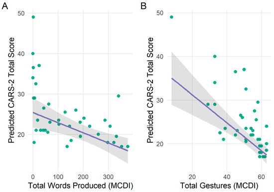 (A)Associations between total words produced and autistic traits in toddlers with Down syndrome. (B) Associations between total gestures and autistic traits in toddlers with Down syndrome.