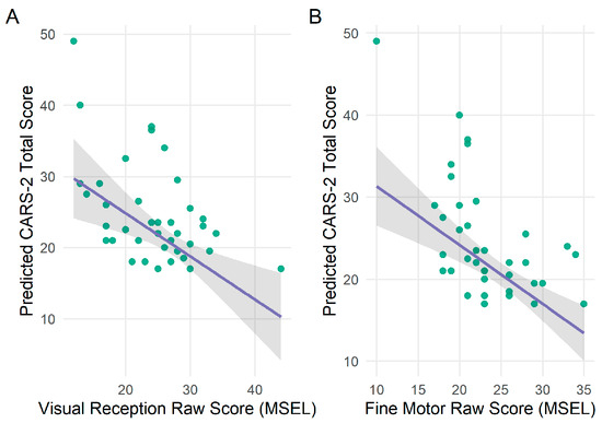 To address our final research question, using raw scores from the MSEL, we ran two robust regression models to examine the associations between Fine Motor, Visual Reception and autistic traits (i.e., CARS-2 scores) in toddlers with DS (See Table 4). After controlling for child chronological Age and Site, Visual Reception (b = −0.61, SE = 0.17, t(34) = −3.48, p = 0.002) and Fine Motor (b = −0.72, SE = 0.15, t(34) = −4.76, p < 0.001) were significantly associated with autistic traits in toddlers with DS. Specifically, a 1-point increase in visual reception raw scores was associated with a 0.61 reduction in CARS-2 scores, or conversely, roughly each additional 1.6 points on the visual reception subscale was associated with a 1-point reduction on the CARS-2. Similarly, we found that each additional raw score on the fine motor subscale was associated with a 0.72 reduction in CARS-2 scores, or for approximately each additional 1.4 points in the fine motor score was associated with a 1-point reduction on the CARS-2. Please see Figure 2 for associations between CARS-2 and MSEL.