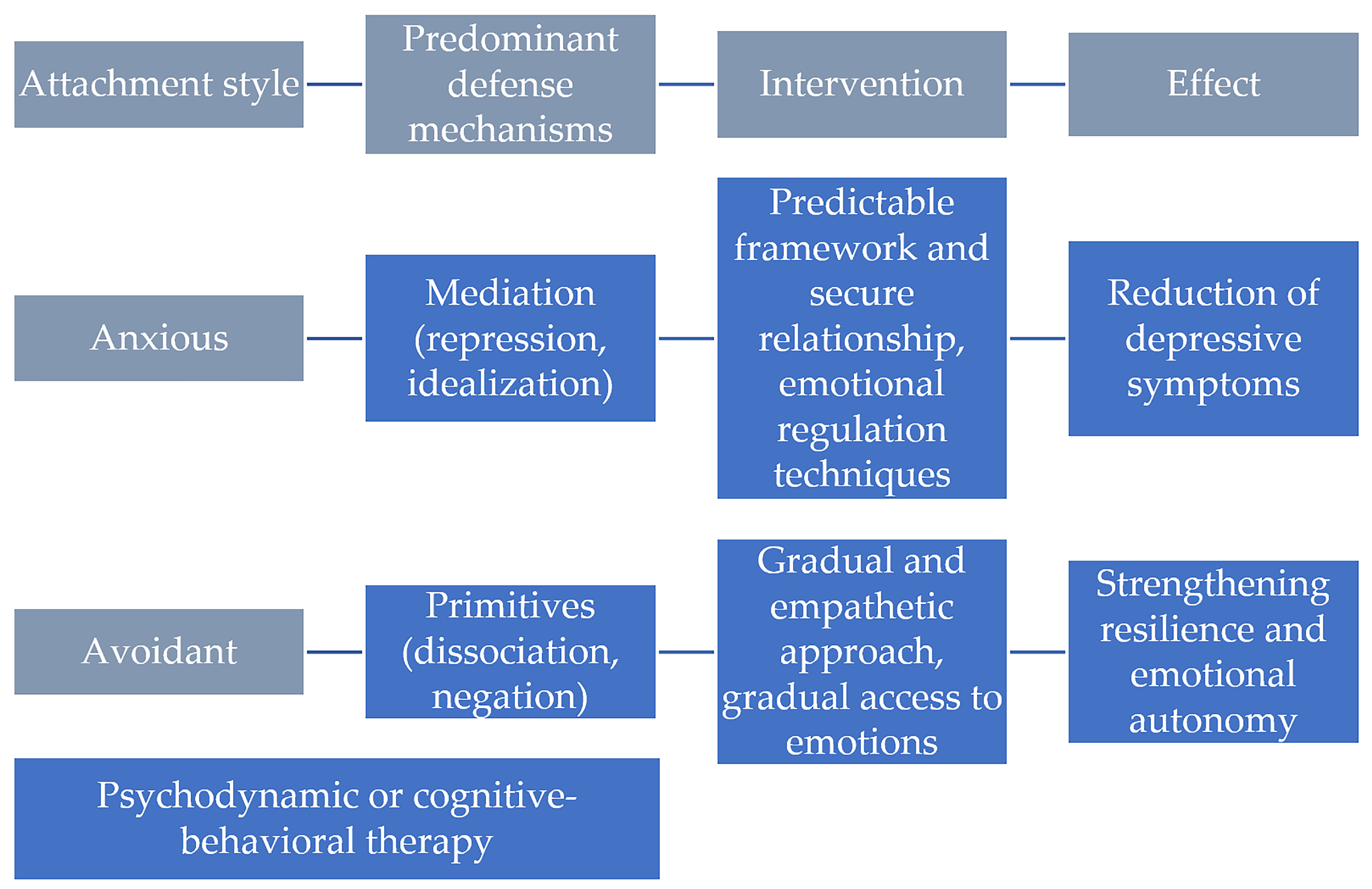 People with an avoidant attachment style, who tend to suppress emotions and avoid intimate connections out of fear of vulnerability, frequently rely on primitive defense mechanisms, such as dissociation or denial. In their case, a gradual and empathetic approach is essential, with an emphasis on accessing emotions at a tolerable pace, to avoid retraumatization or breaking the therapeutic alliance. Therapies such as Mentalization-Based Therapy (