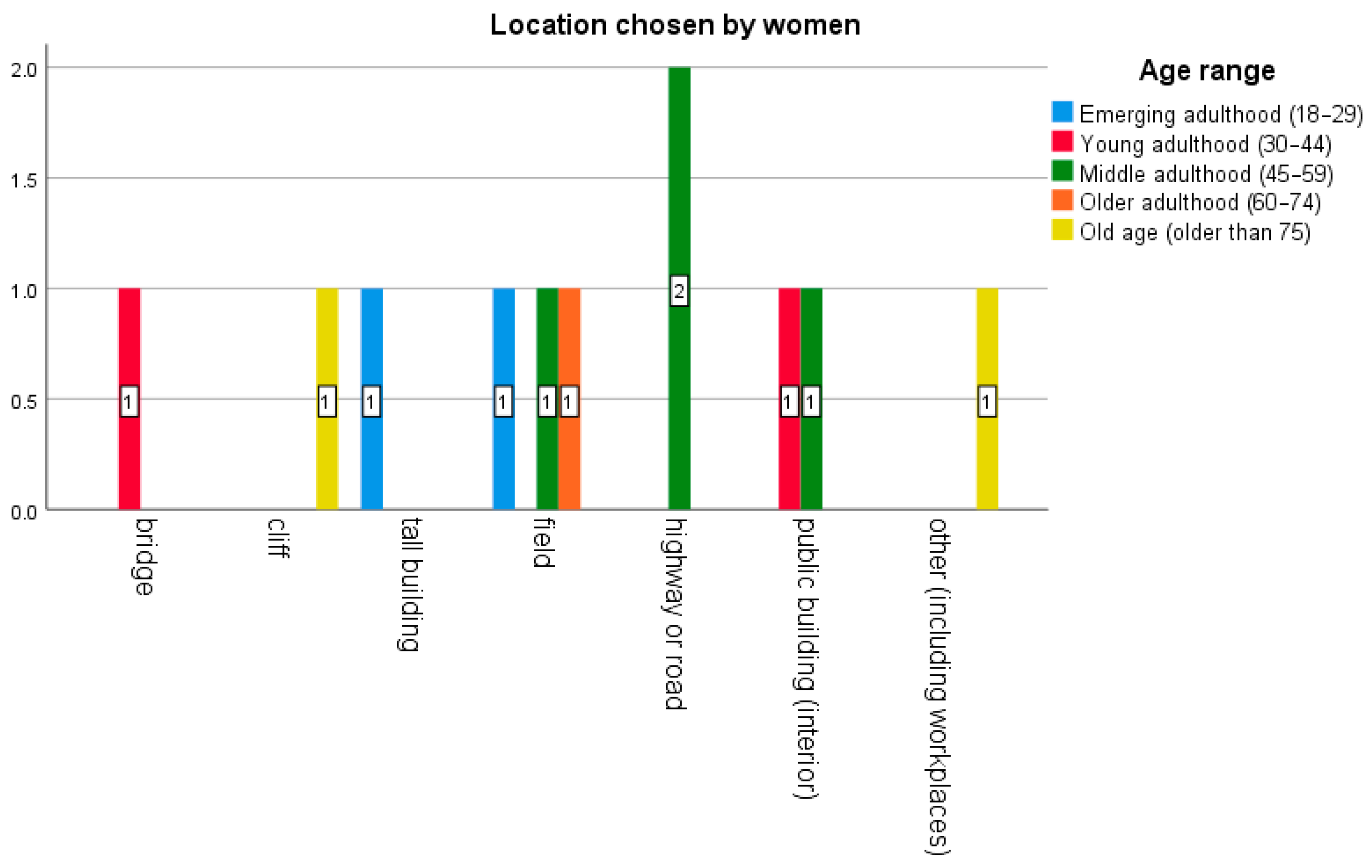 | Location | Jumping | Hanging | Firearm | Poisoning | Inhalation | Drowning | Stabbing | Vehicle Collision | Total | Total |