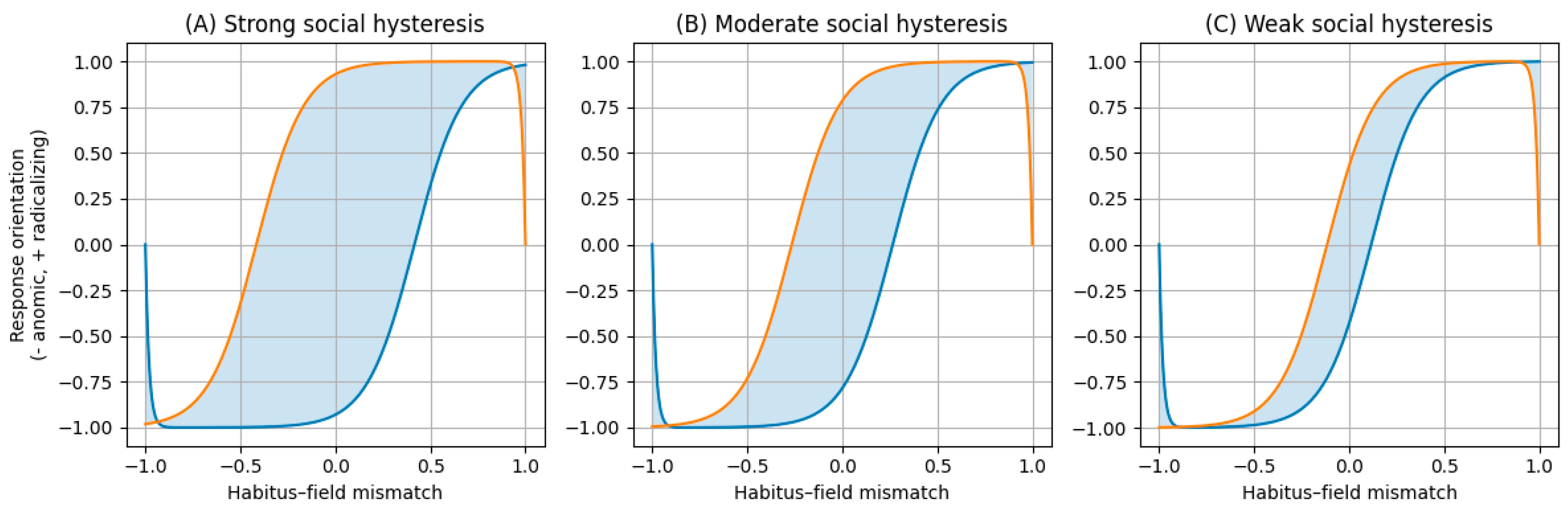 - E6. Social infrastructure as a loop parameter. Relational and institutional infrastructures should reduce the probability of stabilising in an anomic regime and facilitate transitions out of it, thereby narrowing hysteresis and reducing harmful persistence.