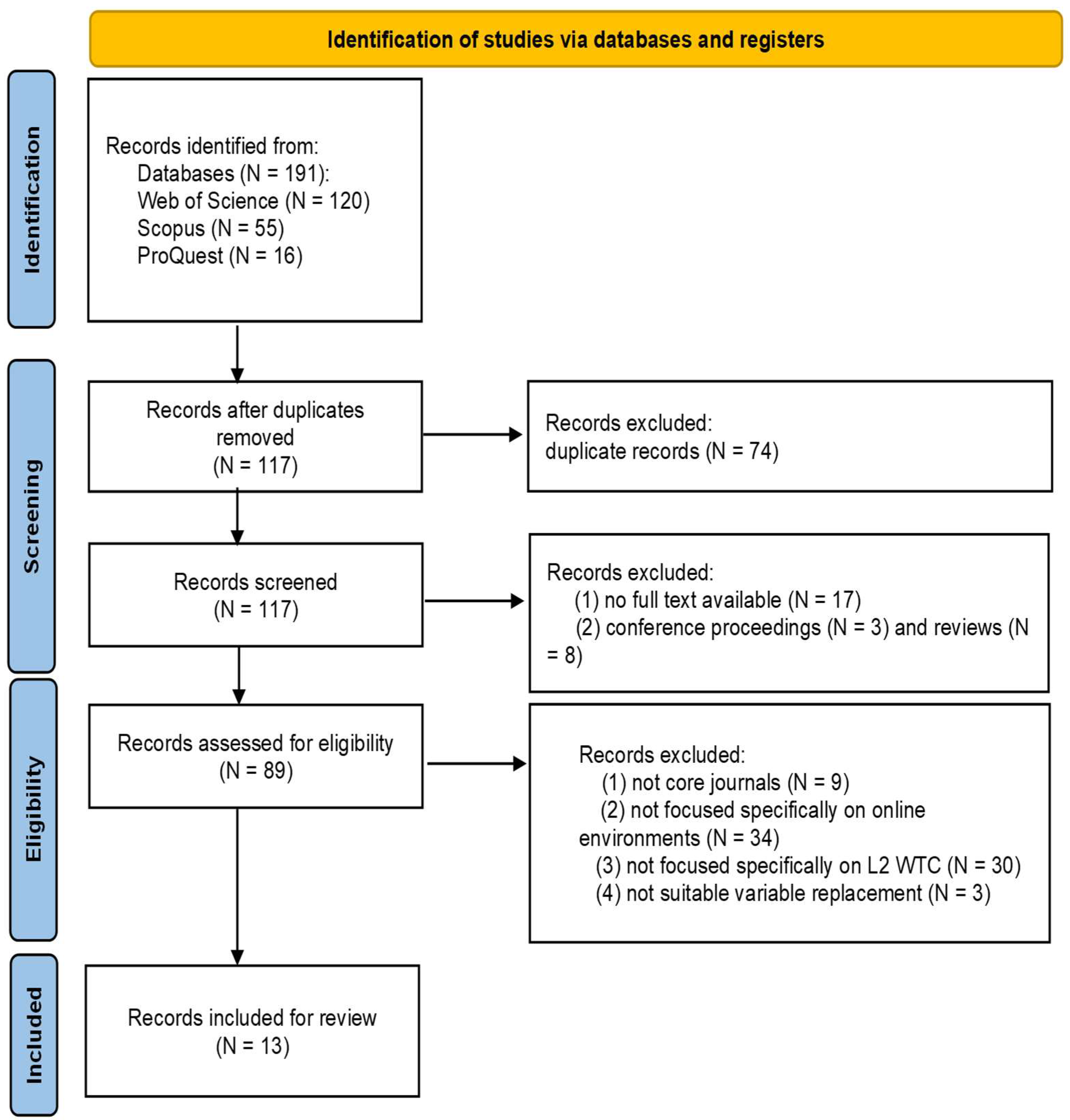 Wang, F.; Yu, X.; Pan, X. L2 Willingness to Communicate in the Context of Online Learning Environments: A Systematic Review. Behav. Sci. 2026, 16, 229. https://doi.org/10.3390/bs16020229