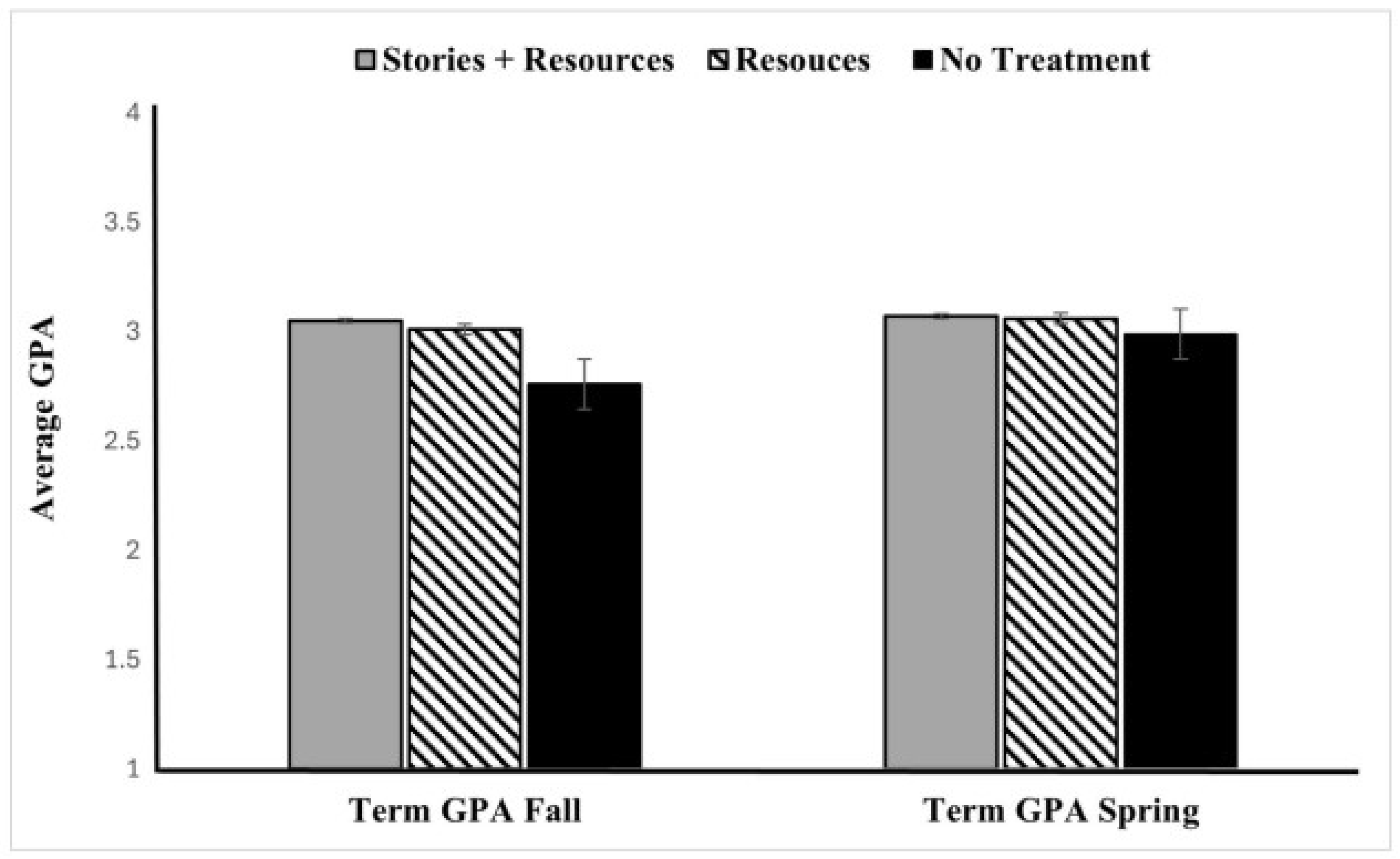 The results revealed a main effect of treatment on GPA, primarily observed in the Fall semester. Students in both intervention group (Stories + Resources and Resources only) earned higher GPAs compared to the No-Treatment group. Notably, the two treatment groups were similarly effective in raising academic performance in general.