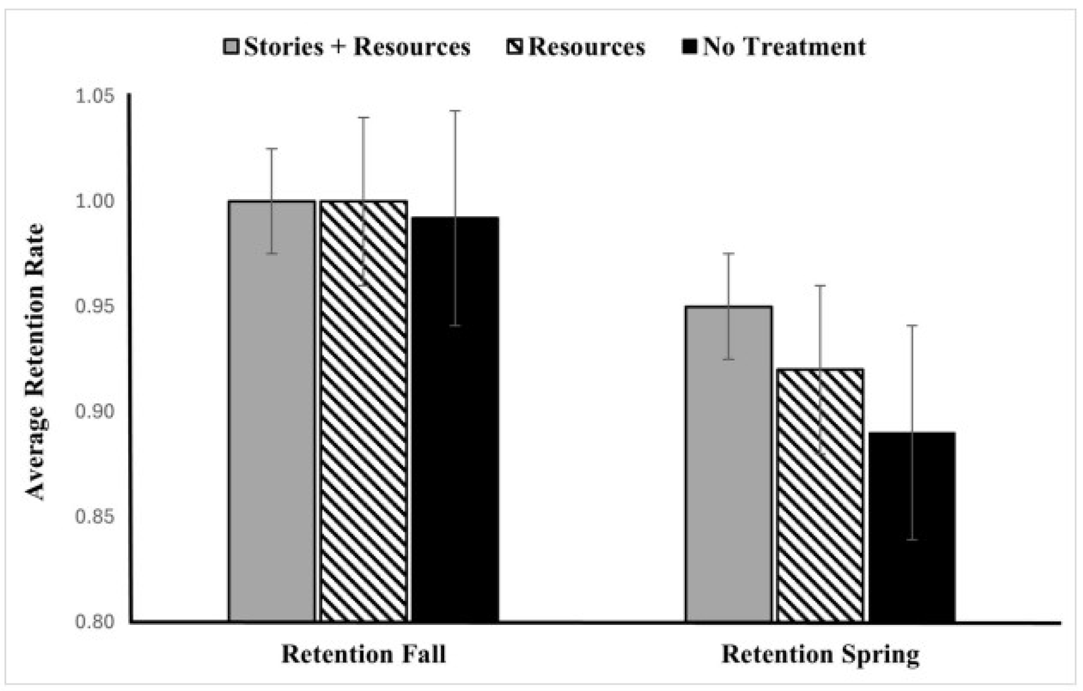 In contrast to the GPA results, the analysis of retention revealed a different set of results. The intervention had a significant overall effect on persistence, with this effect emerging more clearly in the Spring semester. Specifically, students in the Stories + Resources group were more likely to remain enrolled than those in the No-Treatment group, while the Resources-only group did not produce a significant difference. The inclusion of student narratives may have offered an added benefit during a period of heightened uncertainty.