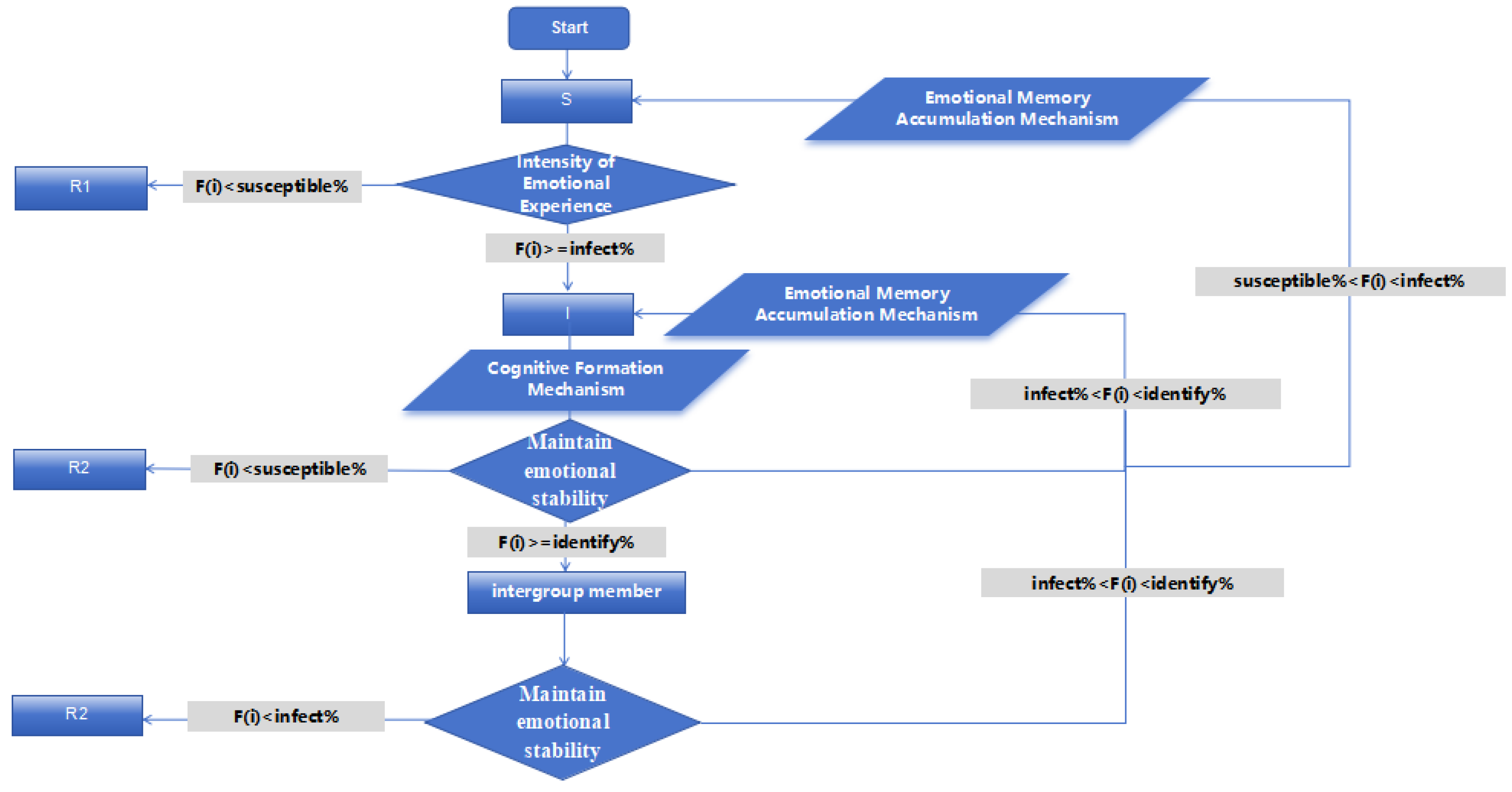 - Out-group (5%): Individuals who actively reject and maintain non-alignment with the group’s emotional consensus after cognitive processing, thereby achieving cognitive immunity, i.e., R2-state individuals (black tiles).