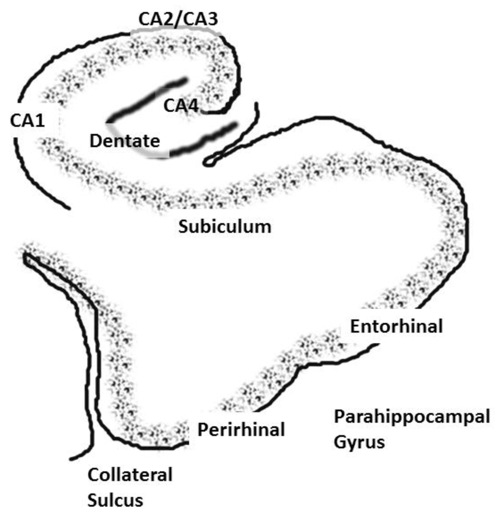 The role of the hippocampus in relational (declarative) memory is in binding together multiple inputs to create and allow for the storage of representations of the associations among the constituent elements of scenes and events [17]. This function ultimately results in the storage of long-term memory in widespread cortical regions. The hippocampus communicates with widespread regions of cortex through a group of highly interconnected brain regions in the medial temporal lobe (these regions will be collectively referred to as the hippocampal system). Hence, aberrant activation of the hippocampus would affect perceptual cortical regions; especially those showing high functional connectivity with the hippocampal system. The hippocampal system consists of the dentate gyrus, cornu ammonis (CA) fields and the subiculum. The dentate gyrus is an input region, which receives input from the entorhinal cortex. The cornu ammonis (CA) fields of the hippocampus consist of pyramidal cells and are usually subdivided into four regions (CA1–CA4). The area that is often referred to as the parahippocampal gyrus in humans actually consists of several subregions. The dorsal part of the parahippocampal gyrus (inferior to the hippocampal fissure), throughout its extent, is called the subiculum (see Figure 1) [18,19,20]. The entorhinal cortex provides the major input to the hippocampus and also receives output from the CA1 layer via the subiculum [21]. The entorhinal cortex provides input to the hippocampus through two pathways, one projecting to the dentate gyrus and CA3 fields and the other to CA1 and the subiculum. The subiculum then sends a major input back to the entorhinal cortex. The subiculum undergoes an unusual and “striking” increase in myelination during late adolescence; a time when individuals with schizophrenia typically experience the onset of the disease [22]. There is also an increase in hippocampal volume at this time in males, and schizophrenia is more prevalent in males [23].