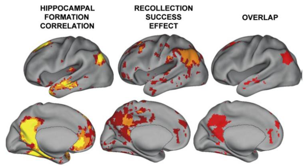 A reproduction of a figure showing regions correlated with hippocampal activity in resting state from reference [74]. These regions overlap with those showing activity related to recollective success. Disclaimer: this is an unofficial adaptation or translation of an article that appeared in a publication of the American Physiological Society. The American Physiological Society has not endorsed the content of this adaptation or translation or the context of its use.