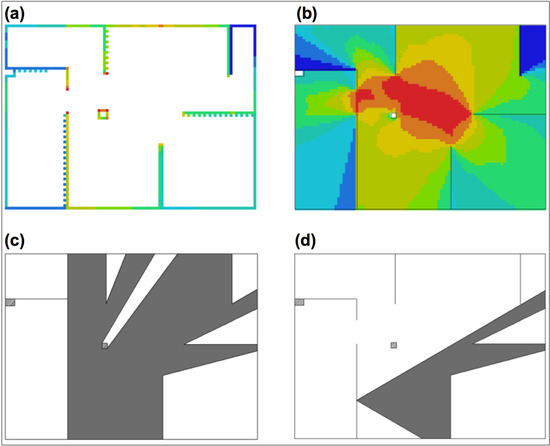 Some spatial analyses used in the study: (a) Boundary Visibility Graph (BVG); (b) Visibility Graph Analysis (VGA); (c) Sample isovist derived for location x105; (d) Sample Visibility Catchment Area (VCA), derived for location x105 (equal to its isovist restricted to a 60° cone).