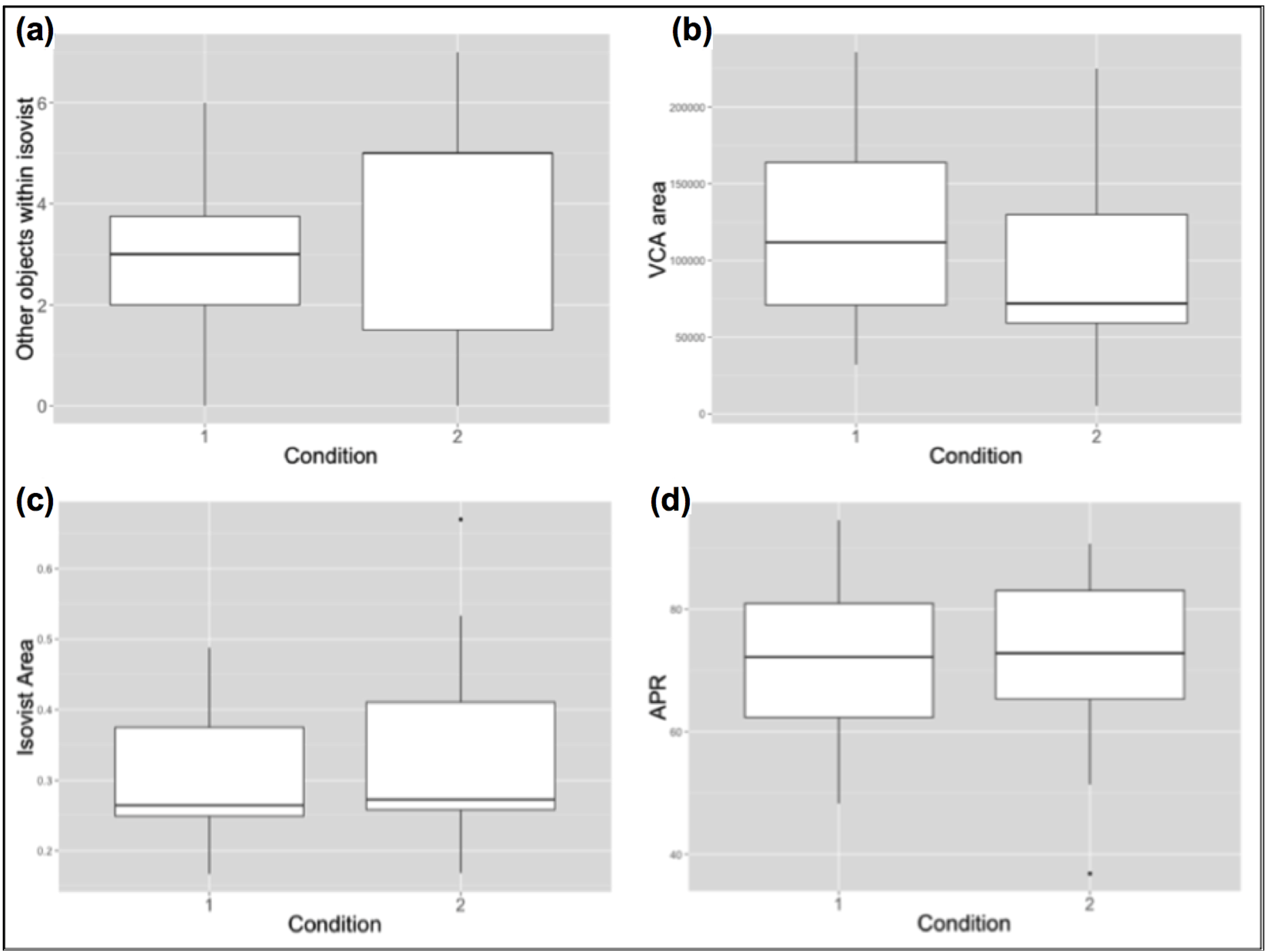 Boxplots presenting differences in spatial measures of picture locations between the two conditions: (a) Higher potential co-visibility in Cond; 2. (b) Lower average VCA in Cond; 2. (c) Similar isovist area sizes; (d) Similar area-to-perimeter ratios.