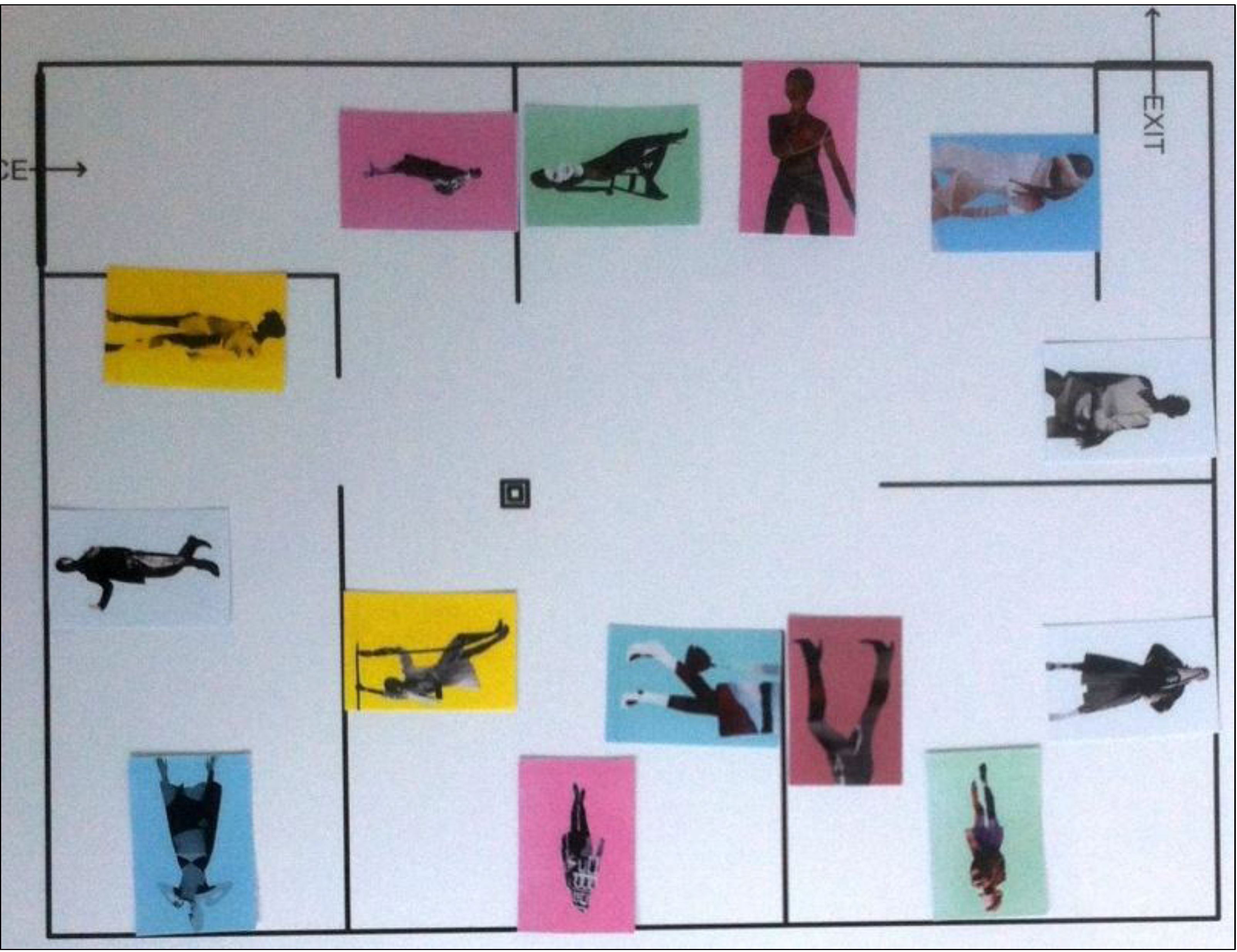 After completing the Recognition Test, participants were asked to move to a table where another task was presented to them, similar to Tour Integration Task [43,48]. They were shown a printed layout of the gallery they had visited and miniature versions of the pictures from the inside. The instruction was to arrange the miniatures on the printed floor plan as they were set out in the gallery. No time limit was suggested. Figure 6 shows a sample solution. For the analysis, the position of each picture miniature was first compared to its true location inside the gallery for each participant. If the participant placed it anywhere along the wall on which the picture was in fact located in the gallery, this participant scored 1 point for this picture. Otherwise 0 was given. Each participant’s score ranging from 0 to 14 was divided by the total number of pictures (14) to create Personal Mean Back-to-the-Wall result. Minimum possible value was 0, which would indicate that a participant placed all miniatures on different walls than they were located in the gallery when this person was exploring it. Maximum possible value was 1, which would indicate that this person placed each picture miniature back on the wall he or she saw it on inside. These personal means were later used for cross-condition comparison.