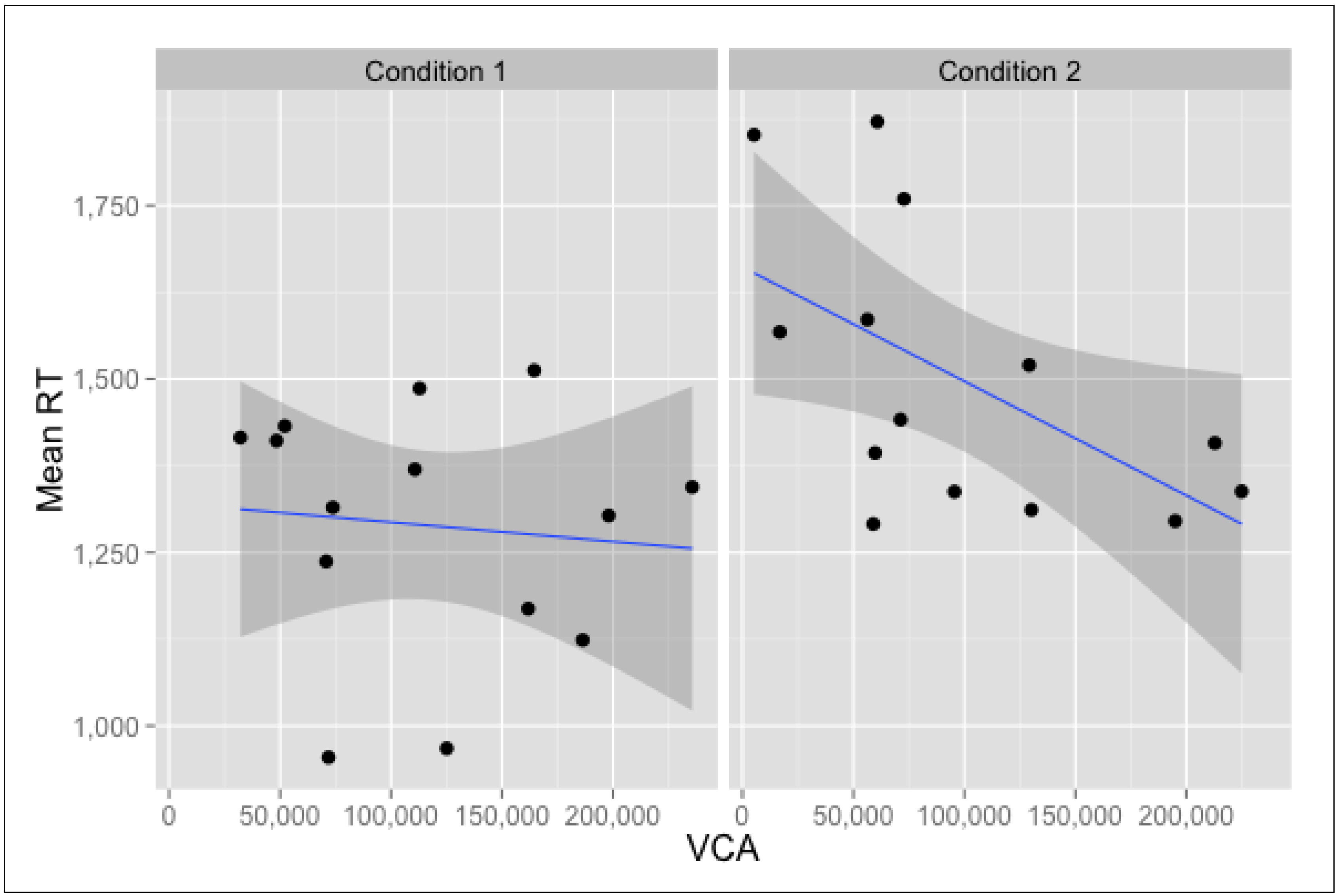 Location-based correlations for Mean Reaction Time and Visibility Catchment Area (VCA). Data points represent locations.