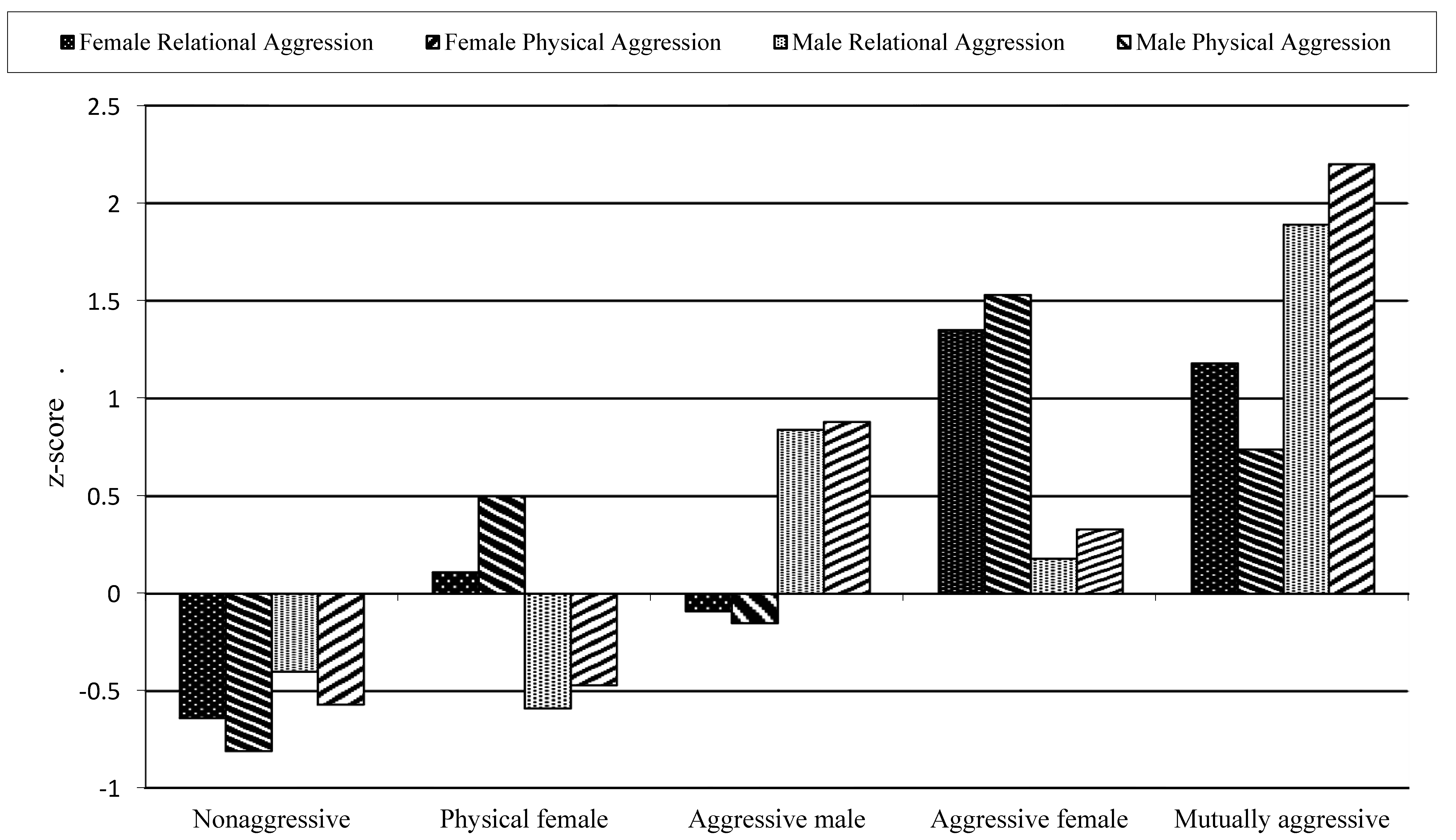 The cluster analysis revealed that the five-cluster solution produced distinctive and homogeneous groupings that explained 62.9% of the error sum of squares. The standardized scores for these five clusters are presented in Figure 1. To interpret the clusters, we used ±0.5 SD as an indication of differences. The first group, termed nonaggressive, consisted of 79 dyads in which the males and females both reported below average levels of psychological and physical aggression. The second group, termed physical female, consisted of 38 dyads in which the females reported above average levels of physical aggression and the males reported low levels of aggression. The third group, termed aggressive male, consisted of 27 dyads in which males reported high levels of both psychological and physical aggression. The fourth group, aggressive female, included 34 dyads in which the females reported high levels of psychological and physical aggression. The final group, labeled mutually aggressive, consisted of 11 dyads in which both females and males reported high levels of psychological and physical aggression.