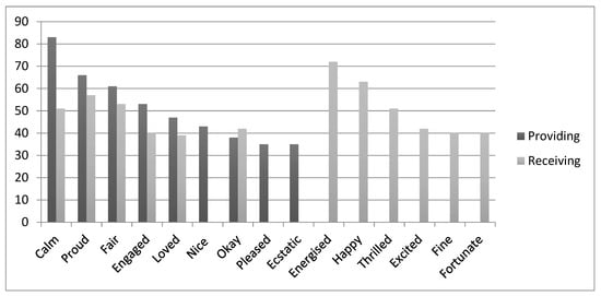 It was noteworthy that Canadians felt more “thrilled”, “content” and “pleased” when providing rather than receiving excellent service. Receiving, rather than giving amazing service was, on the other hand, more associated with a positive association with the emotions, “exhilarated”, “energised”, “happy”, “loved”, “relieved”, “pleasant” and “fine” (p < 0.05).