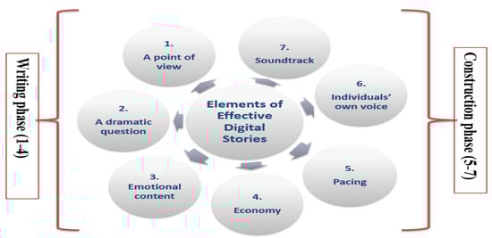 There are seven main elements for an effective digital story, including (1) a point of view, (2) a dramatic question, (3) emotional content, (4) economy, (5) pacing, (6) the gift of your voice, and finally (7) soundtrack. These elements can be classified in two main phases, namely the writing phase (1–4) and the construction phase (5–7), as illustrated in Figure 2, below.