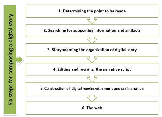 In another study [], it was revealed that students could make significant progress when their instruction moved from making a digital story to an individually improved personal narrative and a persuasive digital story. Throughout the creative story phase, the learners learned how to use the six steps of Kajder for composing a digital story, how to improve perspective, how to convert a written text into an oral narrative, and how to convert a storyboard into a digital movie [].