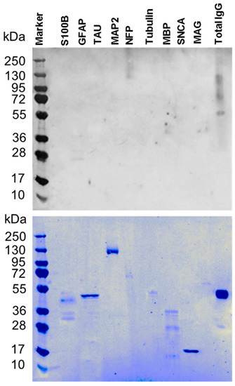 The sources of protein were: Recombinant human proteins NFP, tau, MAP-2, tubulin and MBP purchased from Sigma-Aldrich (Sigma-Aldrich Corporation, Saint Louis, MI, USA); human recombinant GFAP from Biotrend Chemikalien GmbH (BIOTREND Chemikalien GmbH, Cologne, Germany); MAG recombinant protein from Noves Biologicals; S100B from American Qualex International, Inc. (American Qualex International Inc., San Clemente, CA, USA); α-Synuclein from Boston Biochem; human IgG from Fitzgerald; Goat anti-human IgG conjugated to horseradish peroxidase and the enhanced chemiluminescence reagent were obtained from Amersham Pharmacia Biotech (Amersham Pharmacia Biotech, Piscataway, NJ, USA). SDS-PAGE gels (4–20% gradient gel) and 15 mM tris-glycine were obtained from Invitrogen (Invitrogen, Carlsbad, CA, USA). All other buffers were purchased from Thermofisher/Bio-Rad (Thermo Fisher Scientific, Waltham, MA, USA), USA (Table 2 provides molecular weights and protein location in the brain;16).