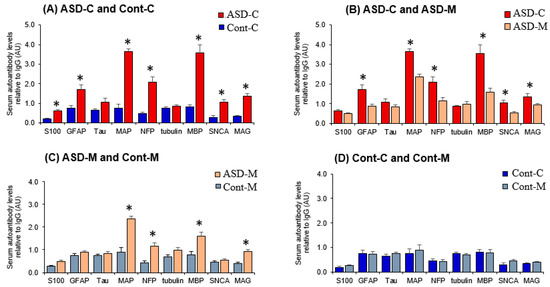Histogram representing the mean levels of autoantibodies against neural proteins relative to total IgG with the bar indicating standard error. Comparison between (A) control children (Cont-C) and ASD children (ASD-C); (B) ASD Children (ASD-C) and ASD children’s mothers (ASD-M); (C) ASD children’s mother (ASD-M); (D) control children (Cont-C) and control children’s mothers (Cont-M). Significant differences with P < 0.05 are indicated in asterisks and the actual p-values are presented in Table 3.