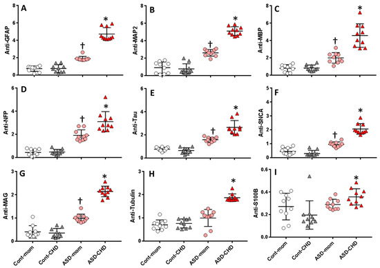 Scatter Plot showing the distribution of neural autoantibodies in Control Children’s mothers (Cont-M), Control children (Cont-C), ASD children’s mothers (ASD-M), ASD children (ASD-C) relative to the total IgG levels. Autoantibodies against (A) GFAP. (B) MAP2, (C) MBP, (D) NFP, (E) Tau, (F) SNCA, (G) MAG, (H) Tubulinand, (I) S100B. The cross line on the dot plot represents the mean values for each protein. The vertical line represents SEM. † P > 0.05 or * P < 0.01 is considered significant.