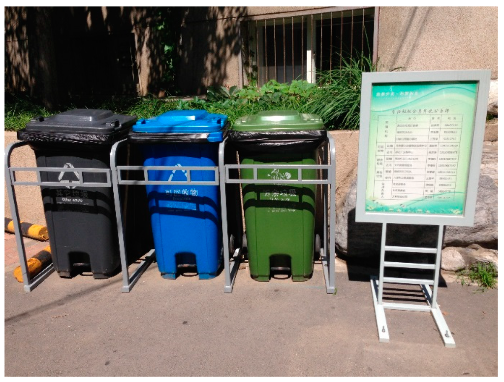 - Deng, J.; Xu, W.Y.; Zhou, C.B. Investigation of waste classification and collection actual effect and the study of long acting management in the community of Beijing. Environ. Sci. 2013, 1, 395–400. (In Chinese) [Google Scholar]