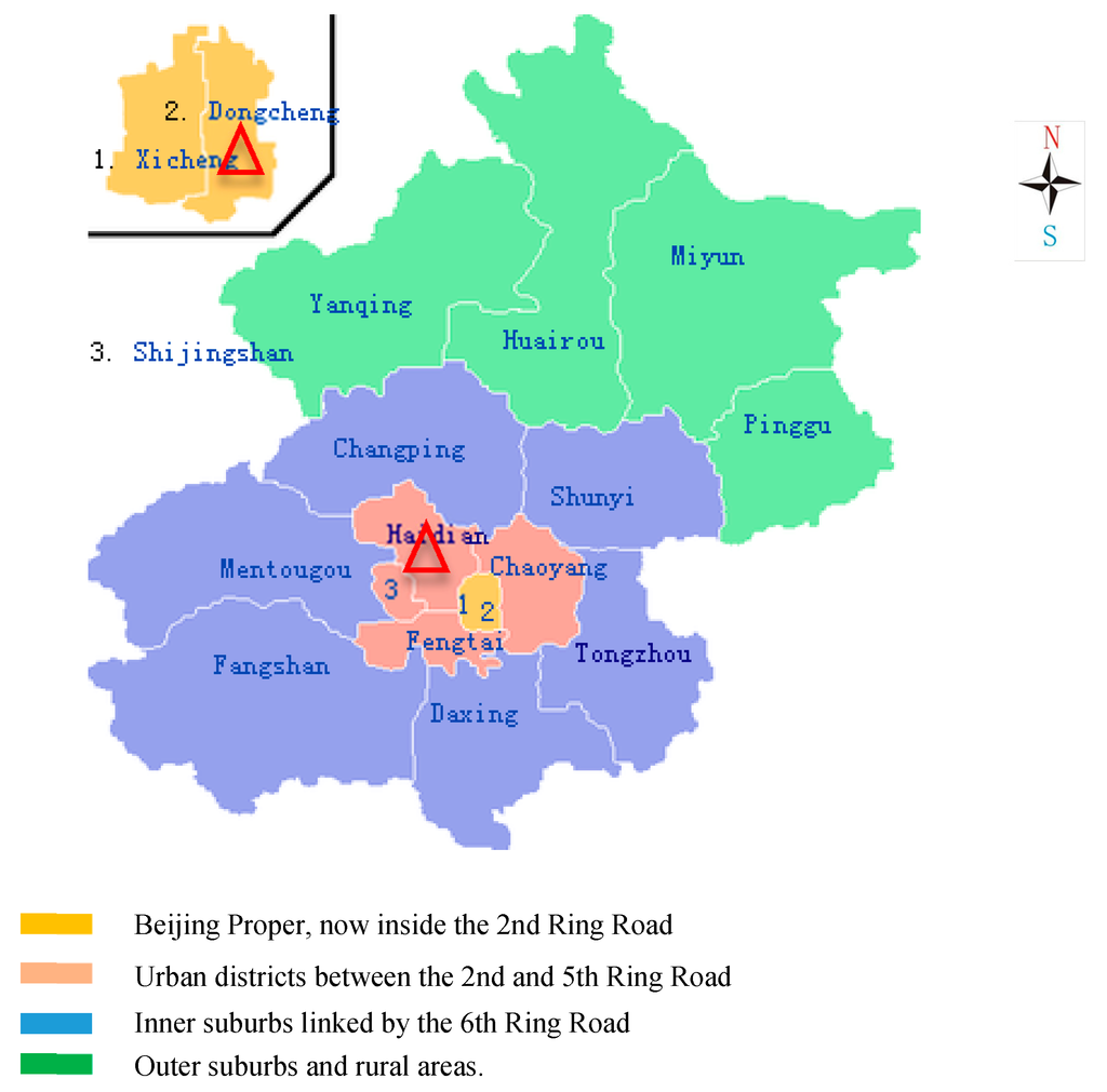 This study focused on the main area of Beijing city, namely the red and yellow parts as Figure 2 shows, which includes six districts: Dongcheng, Xicheng, Haidian, Chaoyang, Fengtai and Shijingshan. During this survey, a three-stage sampling technique was employed. The first stage involved the use of purposive sampling techniques, whereby two districts, Haidian and Dongcheng, were selected. Because of time and budget constraints, 12 communities (8 from Haidian and 4 from Dongcheng) were randomly selected from all of the 651 pilot communities of Dongcheng and Haidian districts (511 from Haidian and 140 from Dongcheng). During the third stage, respondents were collected randomly and interviewed face-to-face in each selected community. We realized that each target community had a different number of residential buildings with a different number of households (600–3000). To acquire the necessary information and to ensure that the selected households cover all parts of the community, we visited the community service center of each target community before conducting the survey. The interviewers visited the communities at different times of the day to avoid interviewing only a particular group of respondents, such as the unemployed, seniors or retirees.