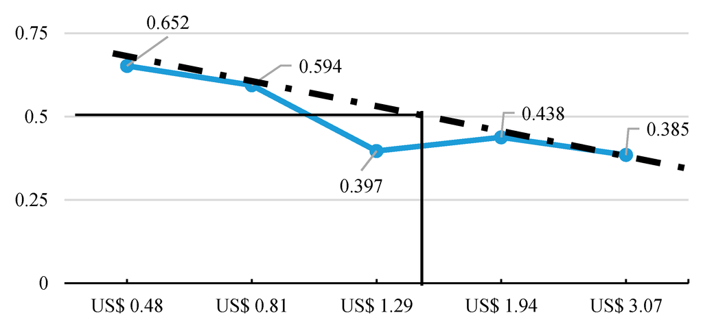 | [95% Confidence interval] (US$ per household per month) | [0.61,2.23] | [0.66,2.16] | |||||