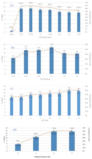 The removal efficacy, average (qe) for, (a) different Fe/Ca molar ratio, (b) different silica sand percentages, (c) different pH values, (d) different Ethylene glycol values, (e) different drying temperatures, (f) multi recoating cycles.