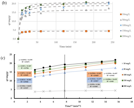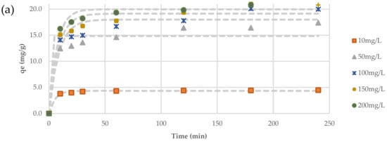 The time required to reach equilibrium in the batch study is a critical factor in defining the diffusion of contaminants between aqueous and solid phases. Therefore, the effects of contact time on the adsorption of TC onto the new adsorbent were investigated at different contact times (0 to 250 min). The experiments were repeated for different initial concentrations of TC (10 to 200 mg/L) to understand the effects of TC concentration on the performance of the new adsorbent. The initial pH, the dose of adsorbent, and agitating speed were kept constant at 7, 0.1 g/50 mL, and 200 rpm, respectively. Figure 11a shows the results of these experiments; it can be seen from this figure that the TC elimination percentages increased quickly during the first hour of experiments, then slowed down during the rest of the experiments. Slower adsorption might be due to the increase of the number of occupied sites on the adsorbent’s surface. It can be noticed that 180 min is sufficient to reach the maximum adsorption of TC; however, most of the TC was adsorbed within the first 60 min. In terms of TC concentration, it was noticed that increasing TC concentration from 10 to 200 mg/L dropped the removal efficiency from 90% to 21% respectively. The limited availability of empty sites on the surface of the adsorbent could explain this decrease of the removal efficiency with the increase of TC concentration.