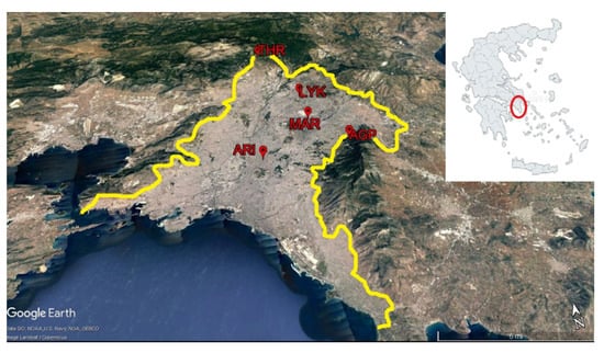 GAA is a vast metropolitan area in the Attica peninsula that comprises the cities of Athens and Piraeus (the port), as well as its suburbs. It mostly covers the Attica basin and is included within the administrative limits of five Attica Region Regional Units: Central, South, North and West Sectors of Athens and Piraeus. According to the Hellenic National Census of 2011, GAA has a population of around 2.6 million people, accounting for 69% of the entire population of the Attica Region []. The GAA basin is encircled by mountain peaks. More precisely, the mountain Egaleo (468 m a.s.l.) is located on the west side of GAA. Parnitha mountain (1413 m a.s.l.) is located on the north north-west side of GAA, Penteli mountain (1109 m a.s.l.) on the north north-east side, and Ymittos mountain (1026 m a.s.l.) on the east side. The GAA’s lone opening is in the south, on the coast of the Saronic Gulf, which is part of the Aegean Sea. The GAA has a moderate climate that is similar to that of the Mediterranean. Even in the middle of winter, bright days are common. Rainfall is mostly from October to April; however, rainfall is generally modest throughout the year, averaging 400–450 mm. The mean monthly low temperature is about 7.0 °C, while the mean monthly maximum temperature is around 31.8 °C. Finally, the prevailing winds are from the south, resulting in the surrounding mountains coexisting with a substantial air pollution problem due to poor air circulation and air pollutants dispersion [].