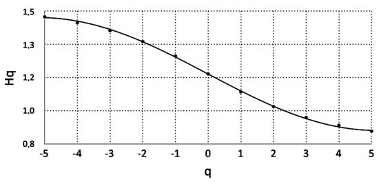 Generalised Hurst exponent () versus qs for the AGP monitoring station and date 28 July 2007 (case i/i = 2 of Table 2).