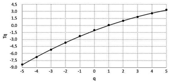 As mentioned in Section 3, the generalised Hurst exponent of the MFDFA of the series in Figure 2 is related to the classical scaling exponent , according to Equation (8). Figure 3 presents the variation in the classical scaling exponent with q. The indicated polynomial trendline corresponds to a polynomial of order 2 with equation and adjusted . At a first glance, this non-linear association implies that there is multifractality in the corresponding two-month window and hence multiple classical Hurst exponents describe the underlying environmental system. However, a closer observation indicates a very small non-linearity coefficient (). Under this view, the linear fit of the corresponding relation shows that , with the square of the square of the Spearman’s correlation coefficient , makes the linear approximation valid as well. This is a very important fact because it indicates, additionally to the arguments given in the previous paragraph, that the papers for PM10 in the GAA that were based on classical monofractal approximations (via the analysis, DFA and fractal dimension analysis) provide solid aspects of the problem. Under a different viewpoint, as mentioned, the monofractal approximation of a multifractal system flattens the multifractal effects to an average coefficient of fractality.