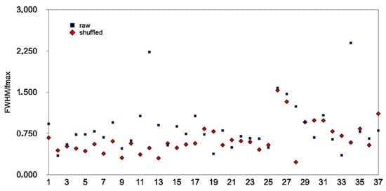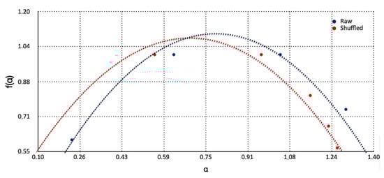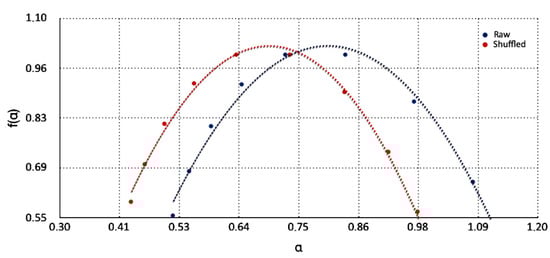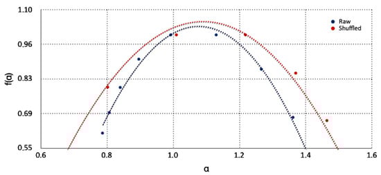 Characteristic example cases of typical multifractal plots of versus are given in Figure 4, Figure 5 and Figure 6. It is very interesting that these multifractal plots are similar to those reported in other related publications [,,,,,], as well as in environmental pollution series [,,,]. It should be emphasised here that the sources of multifractality in the time series of these figures may originate because of the (a) existence of a broad probability function; (b) the different contributions of the small and large fluctuations to the total long-range correlations; and (c) a combination of both (a) and (b) [,]. The nature of the different contributions of the small and large fluctuations can be investigated by randomly shuffling the original data [,]. The process of shuffling removes all the long-range correlations present in the time series because the data points are rearranged in a random order. Importantly, if the shuffled data series still exhibit multifractal characteristics after the removal of the long-range correlations, then the multifractality of the underlying environmental system is due to a broad probability density function [,]. In this case, the generalised Hurst exponents of the original and shuffled time series will be, more or less, identical. As can be observed from Figure 4, Figure 5 and Figure 6, both raw and shuffled time series exhibit the multifractal behaviour of various maxima and widths and, additionally, shifted one to the other. It is significant that the shuffled series retain the multifractal spectrum, a fact that indicates (as aforementioned) that the source of multifractality of the PM10-generating system in the GAA is the existence of a broad probability function. The width of the spectrum indicates the degree of multifractality in the time-series data [,,,,,,,]. In these publications, the maximum value and width of the multifractal spectrum have been employed as a measure of multifractality and criticality of the multifractal behaviour. In order to calculate the differences in the characteristics of the multifractal associations between and , the next mathematical procedure was followed: