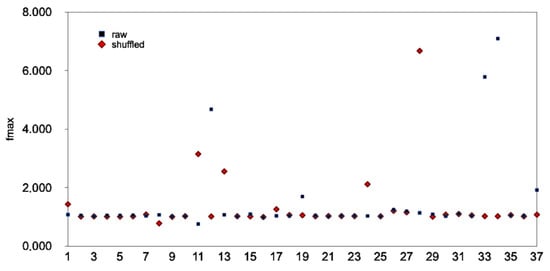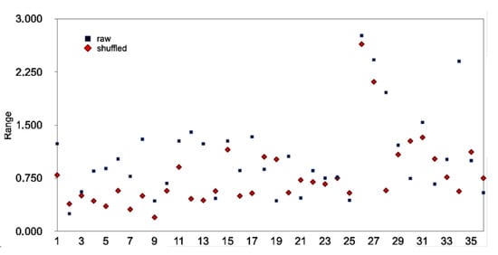 Scatter plot of values versus the i/i value of Table 2. Blue dots indicate the raw two-month series and the red dots the shuffled series.