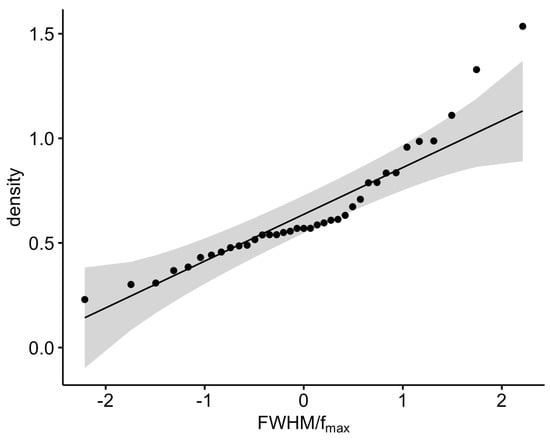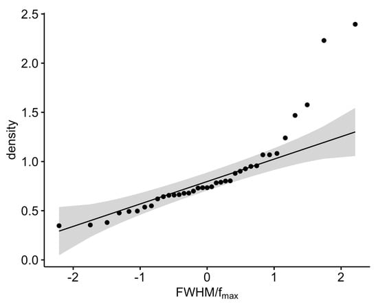 Table 3 presents the MFDFA results according to the methodology described above. In the opinion of the authors, the parameters and are the most informative measures of the multifractal characteristics of the two-month windows of Table 3. Indeed, both estimate the maximum value and width of the multifractal spectrum. Meanwhile, simultaneously, they are mathematically calculated from the fitted curves of the multifractal associations of versus . Figure 7 and Figure 8 present the corresponding value distributions of and of Table 3. What is very interesting is that all - curves have excellent fitting because, in all the cases, the values are quite higher than the critical value of 0.95, which has been utilised in several publications of the team. This interesting fact, significantly, is independent from the curve shape of -. As a further analysis of the data of Figure 8, Figure 9 presents the distribution of the W values derived according to Equation (11). The reader may recall, in association, that the parameter W has been utilised by researchers as a measure of multifractality [,,] in the same manner as is suggested to be used here. Interestingly, as long as the corresponding polynomial curves of versus are not skewed, it is expected that the parameters and W are proportional, at least a priori. It is, therefore, crucial to check whether a linear association between and W actually exists. Towards this, a linear model was built in R, between and W, for both raw and shuffled series. For the raw series, the slope is (2.62 ± 0.8) with Student’s t = 3.290 (p = 0.00234) and F = 10.82 (p = 00238). For the shuffled series, the slope is (0.58 ± 0.07) with Student’s t = 8.069 (p = 2.09 × ) and F = 65.11 (p = 2.086 × ). An excellent linear association is observed in both cases. The higher (t, F) values of the shuffled series (and, consequently, lower corresponding p values) can be attributed to the process of shuffling, which, more or less, provides series, unbiased from potential sources of an additional disturbance. It can be supported, therefore, that both and W are good measures of multifractal broadening, with the parameter to be advantageous due to its strict calculation. For this reason, it is selected in the following as the appropriate broadening measure. In addition, from the view of R statistical density plots, all plots are bimodal, however mainly with a central main peak and a very suppressed second peak. As expected from the density plots, and W are not normally distributed. Indeed, the outputs of the R Shapiro normality test show probabilities of p = 1.128 × for the raw data values and p = 0.0004358 for the shuffled data values, while p = 8.795 × for the raw data W values and p = 0.001317 for the shuffled data W values. All the p values are well below the critical value of p = 0.05 and therefore the hypothesis of a normal distribution is rejected. The results are also verified by the R qq plots with deviations from the limits of normality for and W above 1 in all cases. The average equals 1.586 with the population’s standard deviation of 3.065 for the raw series and 0.770 with the population’s standard deviation of 0.346 for the shuffled series. As in the case of the linear model in R, the shuffling process produces an of a significantly lower deviation. The reader should note that, in both cases, the average and standard deviation are not representative quantities and hence give only raw outlines. On the other hand, the R statistical density plots of parameter are five-modal; however, the main peak is more than 10 times higher from all the other four modes. The probabilities of the R Shapiro normality test are 3.958 × for the raw series W values and 2.329 × for the shuffled series W values; namely, both are much lower than the p = 0.95 threshold. The average equals 1.481 with the population’s standard deviation of 1.360 for the raw series and average 1.333 with the population’s standard deviation of 1.012 for the shuffled series.