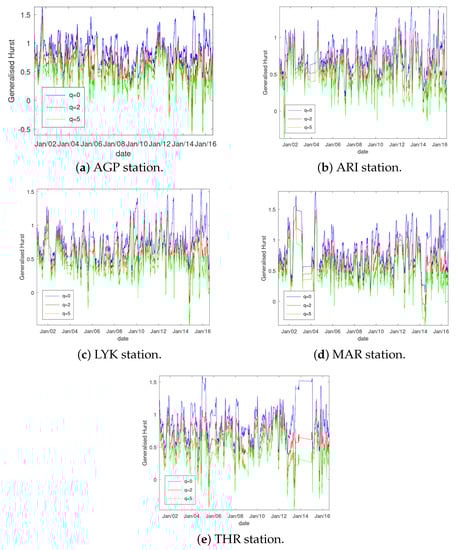 As a final step regarding the multifractal nature of the PM10 system of the GAA, the sliding window MFDFA results are given in all the sub-figures of Figure 13. The generation of these sub-figures necessitated the design of special new software and a significant amount of additional calculations. In the related literature (see the example cases of Telesca et al. [,,,]), the sliding window MFDFA represents the final phase of the analysis of the multifractals, in the opinion of the authors of course. Figure 13 presents three key generalised Hurst exponents of all the series in this paper with a window of four months. The main q’s are given: q = 0, q = 2 and q = 5. These values are positive and hence, as mentioned, refer to the large variations. From the data given already, q = 0 is the cut-off point between the small and large fluctuations. The value refers to the monofractal analysis as in all the previous papers. Finally, q = 5 is an upper value that is usually selected. The four-month window is chosen to combine the two-month windows of the analysis of the main core of this paper and to include more values so as to present additional data. Significant variations can be observed. The q = 0 time variations are higher than the corresponding ones for q = 5. The classical Hurst exponents (q = 2) are intermediate. As expressed in a previous publication [], the values above 1 or below 0 yield to the saturation of the corresponding fractal dimension (to 2 and 0, respectively). Therefore, these values may be considered as = 1 and = 0, respectively. It is also very interesting that certain periods with great plateaus are observed in the values of the generalised Hurst exponents in Figure 13. This is more prolonged in the MAR and THR series. In these plateau periods, the main core of the classical Hurst exponents are around 0.5. This is very significant because, in these periods, the related series are random, namely stochastic and, hence, of a statistical description. The reader may recall that the MAR station is Urban-Traffic, whereas the THR station is Suburban-Background. Therefore, the sliding window MFDFA variations seem to be independent from the type of the station. The reader should draw their attention to the following fact. It is indicated by other researchers, e.g., [], that the differentiations in the window parameters yield to significant over- or under-estimations in the Hurst exponents. In all the analysis, the two-month window is adopted with the exception of the MFDFA sliding window results where four-month windows were used. More or less, variations are observed in all the generalised Hurst exponents of Figure 13, where the main core of the estimations refer to non-fractal and, possibly, stochastic–statistical behaviour.