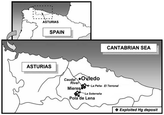 - Loredo, J.; Ordóñez, A.; Gallego, J.R.; Baldo, C.; García-Iglesias, J. Geochemical Characterisation of Mercury Mining Spoil Heaps in the Area of Mieres (Asturias, Northern Spain). J. Geochem. Explor. 1999, 67, 377. [Google Scholar] [CrossRef]
