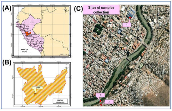 Sampling sites for wastewater samples. The study was conducted in Huanuco, one of the 24 departments, located in the central highlands of Peru, colored in red (A). The city where the sewage sites were collected was geographically delimited (B). The collection sites for samples included the following: (1) urban pipelines, (2) The H. Valdizan public hospital, and (3) ESSALUD social security hospital (C).
